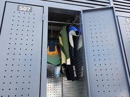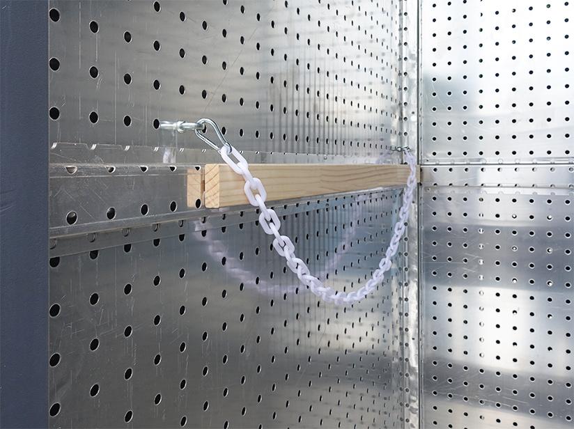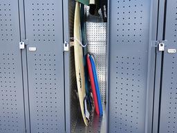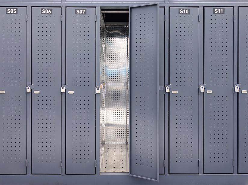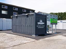 24時間出し入れ可能な屋外型サーフボード収納スペースです。サーフボードを固定出来るチェーン穴や、ウエットスーツを下げられる引っ掛け棒も設置。夜間でも明るい庫内照明も設置している為、早朝にサーフボードを取りに来た際、使えるようにしております。